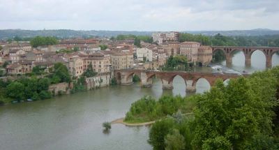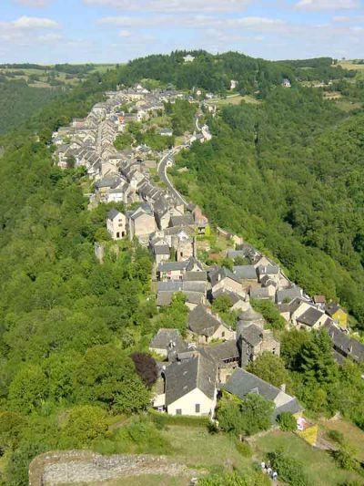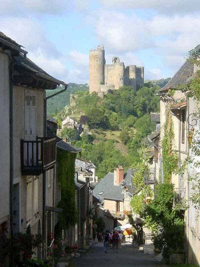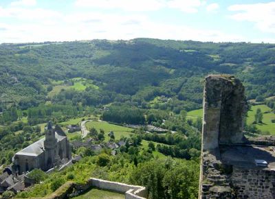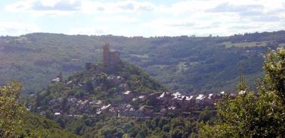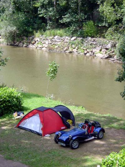Najac - Midi-Pyrenees  Camping by the river under the tiny beautiful hilltop village of Najac on our European Tour. Notice the tent is almost bigger than the car! Dodgy thermostat discovered here which led to having to walk up and down the very long hill from campsite to food and drink in the village!