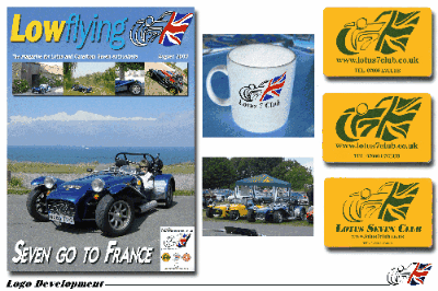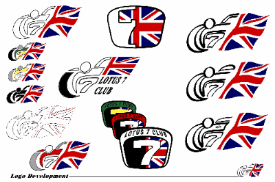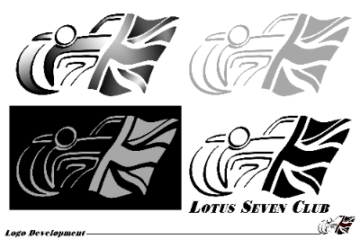 In 2003 I accepted the challenge to have a look at updating the Lotus 7 Club logo design. The old one needed updating, but it was a tough job. The new logo had to satisfy a pretty strict brief. It had to retain links with the old image, had to please Lotus 7 owners and Caterham owners, flared wings, cycle wings and include the UK flag, amongst other things. It would be used on paper, electronically, on the web, on flags, stickers in colour and black and white.