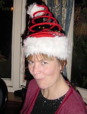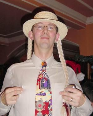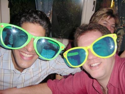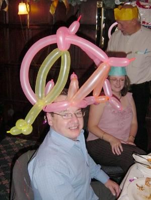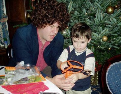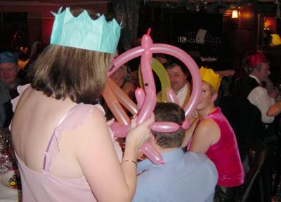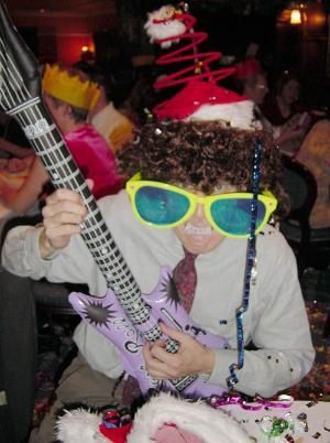 An annual tradition is goody bags for each table, packed with toys, streamers, poppers, silly string and fancy dress! Here, Tessa admires my 70's hair and moustache, which I later choked on.