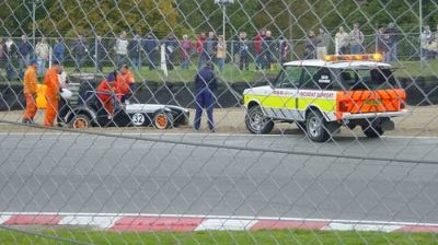 Right away the flags come out and the Brands recovery Marshalls swing into action, towing the car out of the gravel...