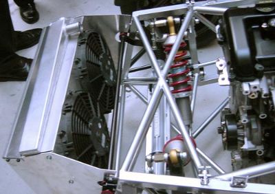 Twin fans on the very wide but very low radiator.Not sure if this is a race car only component or common on all the other models as well.