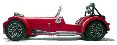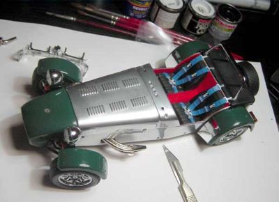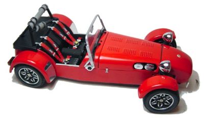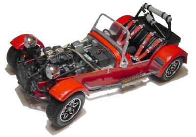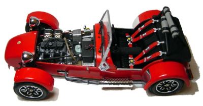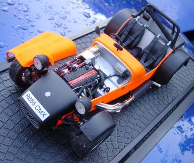 Bob's model is based ona 1:18 scale Kyosho die-cast model. This is not a kit, so the first thing to do is dissmantle the model. It is then reassembled, adding detail where required, and changing all the features to match the customers car, such as engine type, seats and colour. When have you ever seen two caterhams alike?!