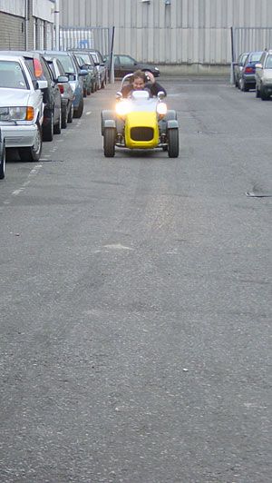 Full pelt down the drive! Surprisingly quick, easy to drive - brakes a bit suspect.