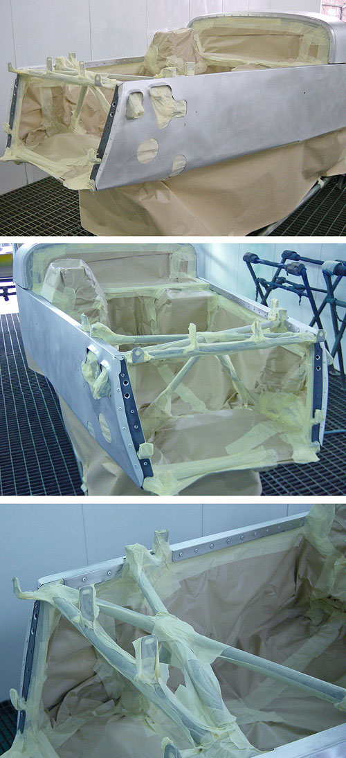 Next the whole chassis is masked ready for spraying the undercoat. The masking is a big job on a Caterham, with an open chassis, lots of holes in the panels for wishbones, dampers etc. But it is important it is done properly, particularly with a powder coated engine bay – any over-spray would be very obvious.