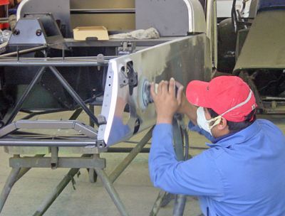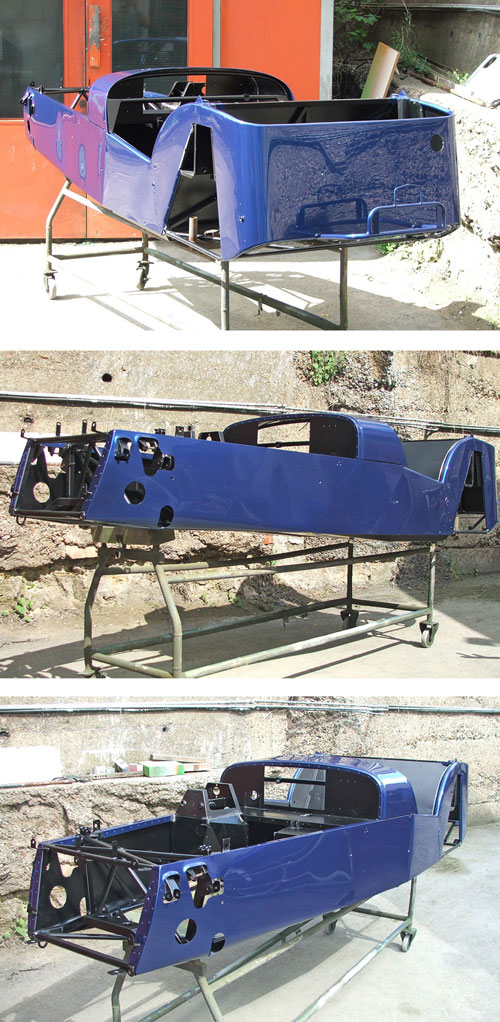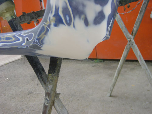 The first stage is to rub down all the parts that are to be sprayed. For the newly panelled chassis it meant rubbing down and keying, and for the original nose cone it meant rubbing down the old paint and filling in any stone chips or cracks.