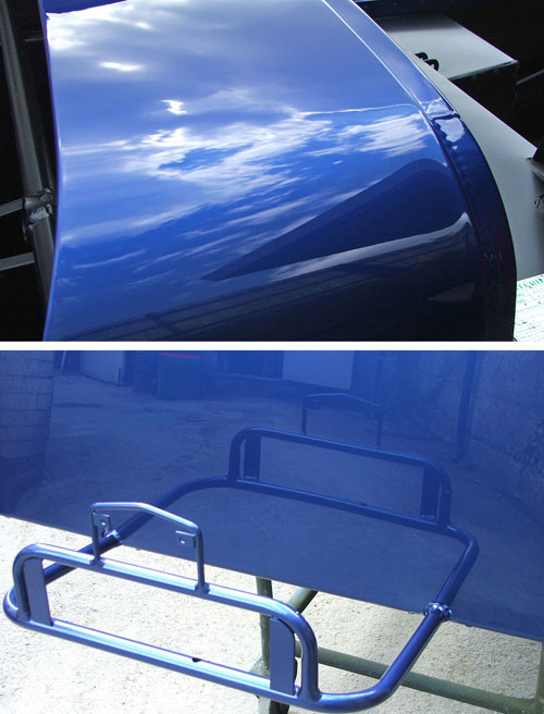 |  | | Once the undercoat has been baked, and maybe rubbed down if required, its time for the colour! This process will consist of (at least) 2 layers – the under colour, followed by a lacquer. The blue colour layer looks really nice before the lacquer – a sort of silvery satin colour. Once the lacquer goes on the familiar blue shine returns! Once again the paint is baked on in the over before returning to the workshop for the final processes.