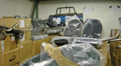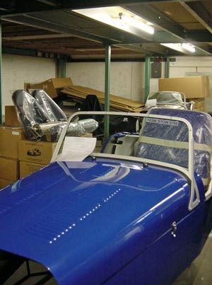 Rather nice blue car, due to be shipped to France to a lucky owner. Note set of seat in the background, with exhaust system on top.