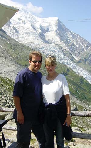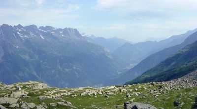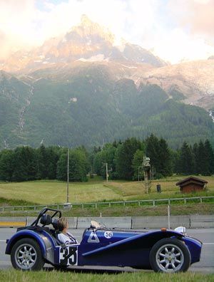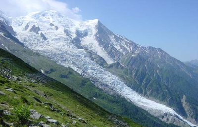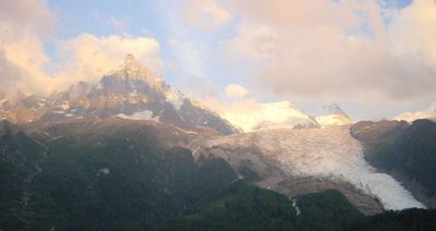 We arrived at Chamonix in the evening. Here we have stopped just near the entrance to the Mont Blanc tunnel. Above us in the evening sun you can see the Mont Blanc range, with the Glacier des Bossons coming down towards us. Arriving later in the day always adds pressure in finding somewhere to stay. After driving around the outskirts of the town looking at B&B's we decided to camp. Our new map had campsites marked, and the second one we looked at was perfect.