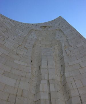 A huge carved figure towers up the inside wall of the monument. The shape is recognizable as that of one of the skelatal figures who were found in these places.