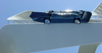 Sir Malcom Campbell's Bluebird land speed record breaking car from 1935. Its 2300hp, 36.5 litre supercharged V12 Rolls Royce engine reached 301.129mph on the Bonneville Salt Flats, Utah.