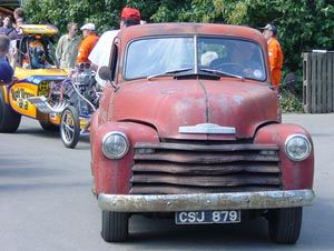 As at previous recent Festival of Speed events, Hot Rods and dragsters were represented and demonstrating up the hill. This is the period tow pick-up, pulling 'Rat Trap' out onto the track and down to the start line.