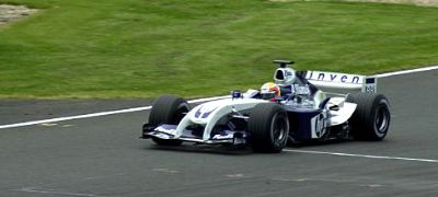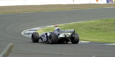 Rear shot of Montoya in the other Williams about to clip the apex at Copse.