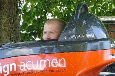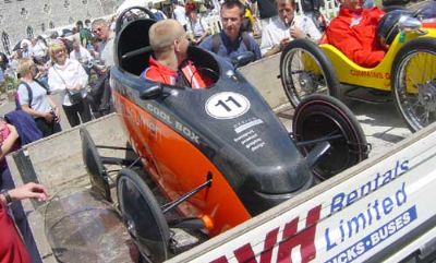 In 2002 we had an entry in the Soapbox Challenge, a downhill race held each year, with strict rules and regulations. Here our driver Nige gets some last minute tips.