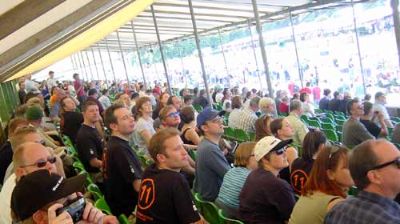 Eager fans in the stands await the arrival of the soapboxes round the sharp corner at the bottom of the steepest part of the hill.