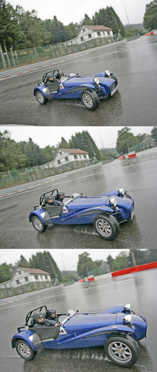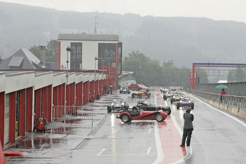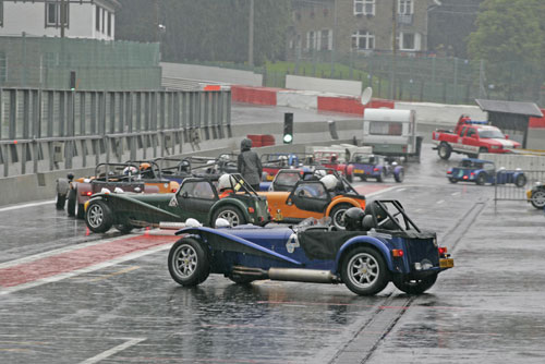 Myself and a friend from work drove to Spa the previous evening, arriving at a small Hotel in Francorchamps in the early hours. It was a wet but easy trip. The next day was also wet - which was daunting for my first time at Spa, though maybe it helps slow you down a bit for the first few laps and prevent you from getting too confident too quickly! Despite the fact that it was the German 7's club, there were only about 4 other Caterhams. The rest of the cars were a mixture of Elises, Exige and mainly Donkervoorts- at least I think thats what they were. Very wide, huge rear tires, and lots of power from there big Ford engines. Worryingly small rollbars though.