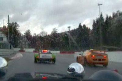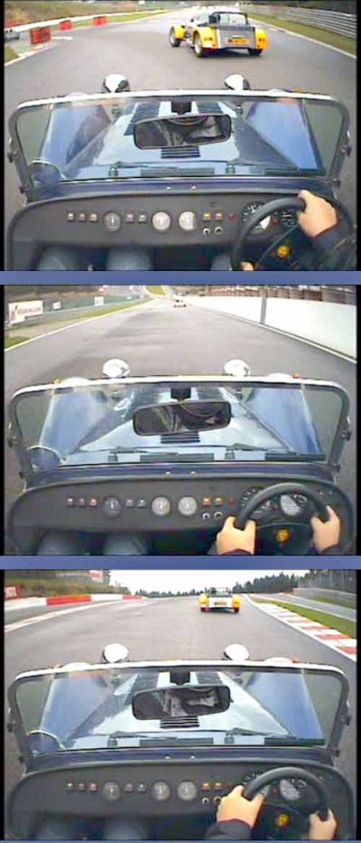 Entering La Source, this Exige is about to undertake both of us. The brake light on the 7'esque car in front is very effective - even if the chrome roll bar is less so, being 2" below the occupants heads!