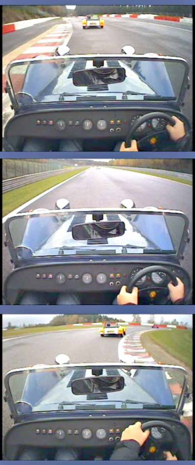 Le Raidillon - We felt under powered here, the car slowing near the top of the steep slope, so a lift lost us all momentum. From this point on the yellow menace would shoot off into the distance. As you can see he is a dot on the Kemel Straight. This is far more uphill than it looks on the TV, and our car lost out here - it was on this straight I decided that I needed more power and would have to upgrade things! Even accounting for the pendulum affect of braking/accelerating, we closed up alot under braking into Les Combes, which was satisfying! The track here was damp, a little slippery, but this bit must be dryish, or I would not have been so close to the slippery painted kerbs! I was treating this track with respect - we were a long way from home, so I was not kissing apexes on the limit, particularly as it was wet!