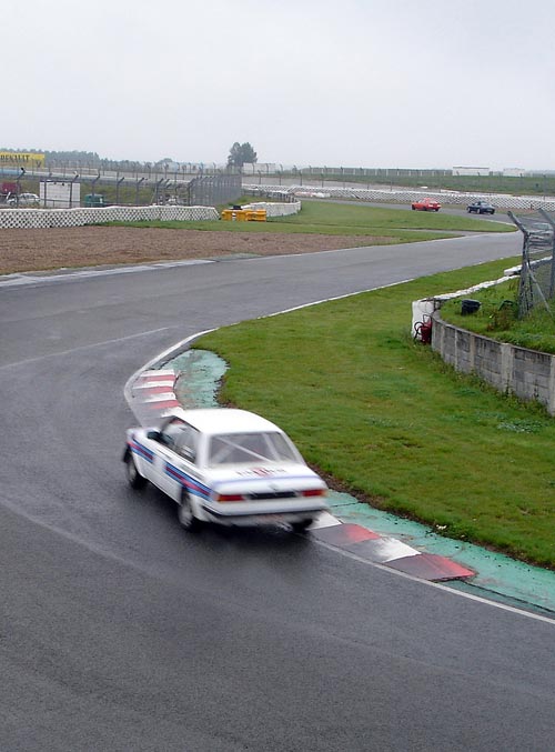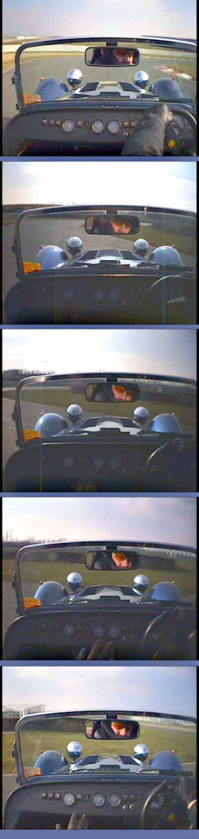 Although it lacks the sweeping majesty of a track like Spa, Croix is a pretty technical and a good place to try things out! You are never going really silly speeds, except for braking into Virage Magguy at the end of the long main straight, so it is an ideal place to 'play' with the car. I had been braking later and later into this corner, having a go at killing understeer. I was playing - we all know sliding is not the quickest way around a corner, but its FUN! I had got to the point where I could enter the corner braking deep, which makes the rear sweep round, and getthrough the whole 180° corner with out moving the steering wheel at all, in one continuous arc. Very satisfying! Except on this lap I got it wrong and had a harmless half spin onto the inside of the track. Kept the engine running and we proceeded back onto the track - just after all the little hot-hatch saloons I had just past streamed through!! You can just see Tessa's hand at the bottom of the screen about to point to these cars as they came streaming round the corner behind us, but by this time we were safely off the tarmac. On another trip, Tony Pashley did a far more spectacular 360° coming out of Virage Du Pont, a high speed, off camber corner under the bridge! We know - we have the film Tony!!