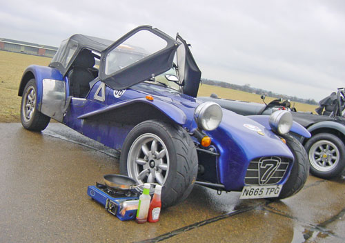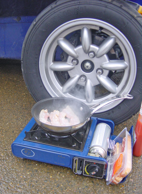 | A genius idea on a cold airfield day - a fresh bacon sandwich!! | |  | Small portable camping stove used to great effect! | |  | You can't really tell in the pictures but the car has sticky Yoko 48's on the front and slippery/hard 539's on the back - the best format for sideways fun! | |  |  |  | This one corner is perfect for this sort of thing. |