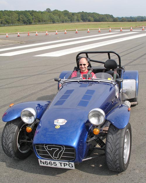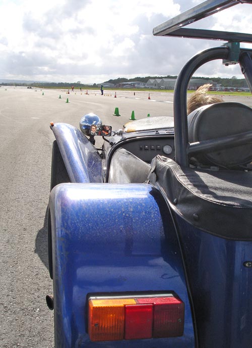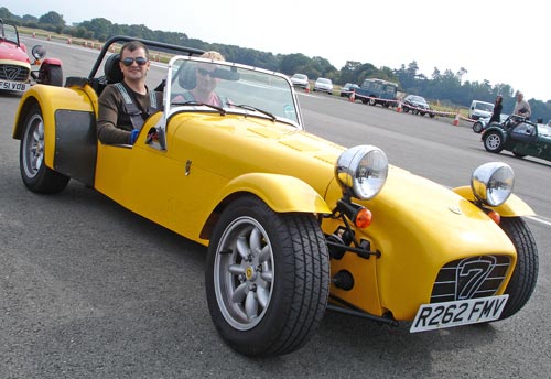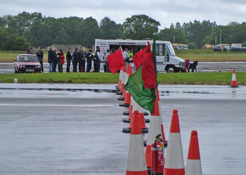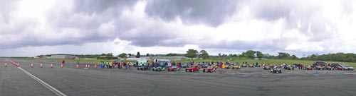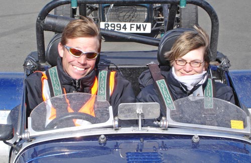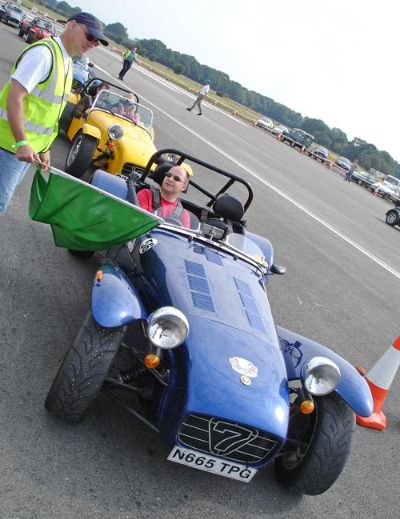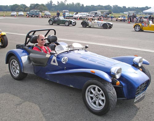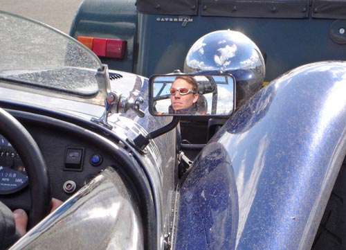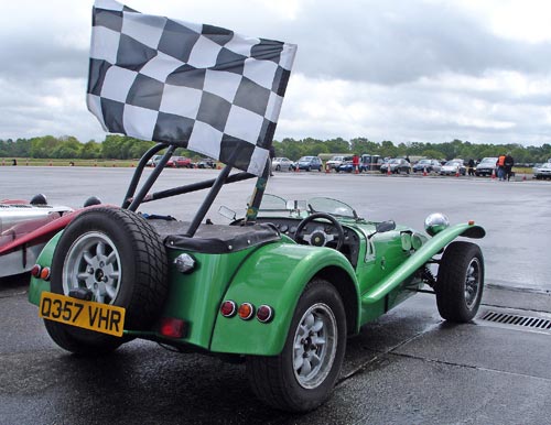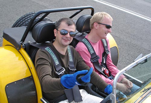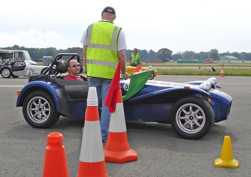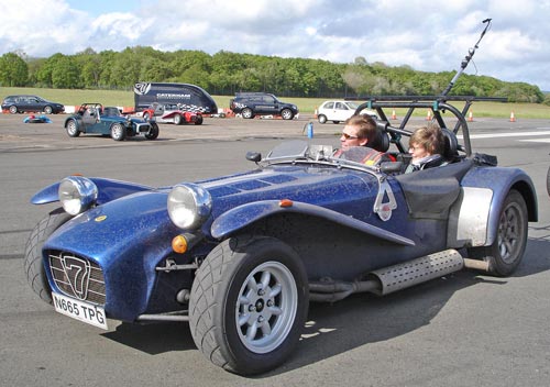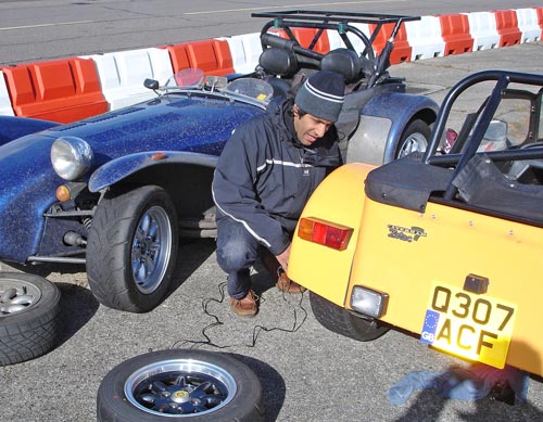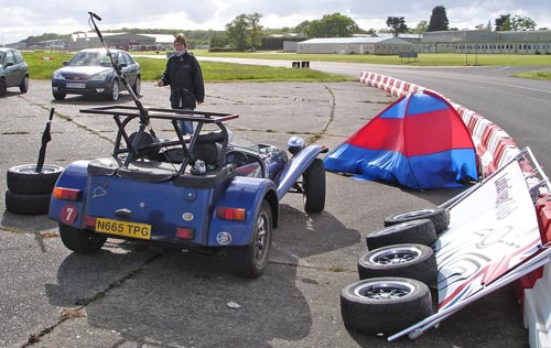 | Lunchtime snacks and coffee from the burger van. | |  | Still not got this yet? | |  | Our little pit area - note the windswept shelter for tools etc, and the 'good' tyres ready for driving home. | |  | Off we go again.... | |  | | |  | Martin has a go in our car - thsi day was a little sunnier! | |  | He already has that fixed grin thing going on! |