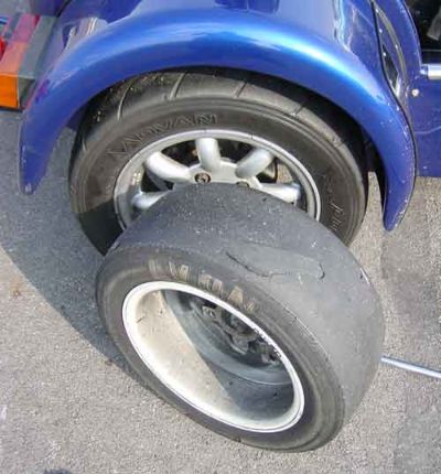 We managed to wear out John's old slicks! This chunk was the cause of a vibration I felt onthe car in the last session of the day. I thought I had broken something!