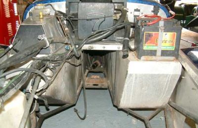 Showing rear swing arms, springs and dampers - the half-shafts and hubs have been removed. You can also see the fuel filter mounted on the back of the rear bulkhead.