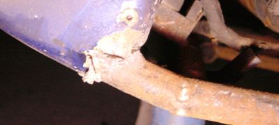 This is the chassis below the rear wheel arch, where the A-frame is bolted to the chassis itself. The damage is hidden by the wheel arch, and cannot be seen in normal view.