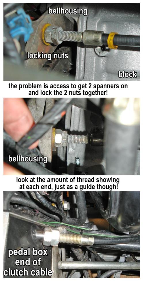 The solution is to reach down, pull the cable out of the bellhousing mount slightly (it will have gone in too far as the nuts move along the thread) and then readjust the nuts back up to the bellhousing flange, making sure that you tighten one, then theother up against it, so locking them properly Access with 2 spanners can be a pain!!