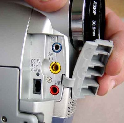 AV plug - this is the important one if planning to use a bullet cam. You can also see in this photo that I have fitted a 'skylight' filter to the camcorder lens. This filters glare, but also provides a replaceable protection to the camera lens. The bullet cam also has a replaceable lens protecting glass cover.