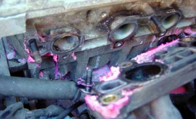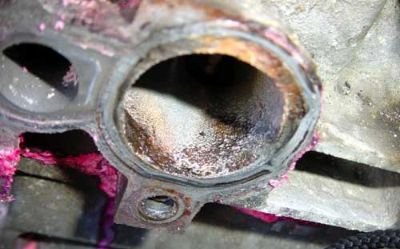 What a mess! 'Red' coolant very visible! The leak was around the coolant channel to the left of the first inlet. This allowed coolant into the cylinder - not good!