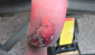 A potential leak spot, where the coolant pipe is rubbing on the nose-cone mounting bracket. Sliding the pipe further onto the water rail solved this issue.