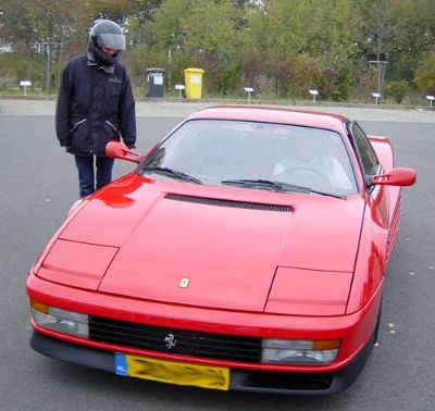 Tessa wondering how the 'holle' do you get into a Ferrari Testarossa?! The door handles are hidden up under the side strakes. I had just taken the owner for a lap in the seven - now he was repaying the ride for Tessa - I was far too scared to passenger with anyone!